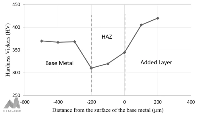 The hardness profile of the repaired impeller is depicted in Figure 4. Notably, the added layer exhibits higher hardness compared to the base metal, despite both being composed of the same Ti6Al4V material. It is essential to highlight that the hardness of the Heat Affected Zone (HAZ) is lower than both the added layer and base metal. This deviation is attributed to the tempering effect induced by the heat flow, leading to an increase in grain size in the affected area. The observed 200 µm thickness of the HAZ, as evident in the micrograph photos, is corroborated by the information provided in this hardness profile.