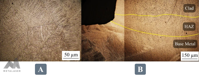 Following the completion of the process, multiple shiny silver clads were produced, showcasing a microstructure detailed in Figure 3-A. This microstructure reveals the presence of α islands within the β background, commonly referred to as Widmanstätten in the literature. Figure 3-B presents a macrograph of one of the added layers. Remarkably, the Heat Affected Zone (HAZ) exhibited a minimal thickness, approximately 200 µm, owing to both the low heat input inherent of the process and the low heat conductivity of titanium grade 5 (7.1 W/m.K).