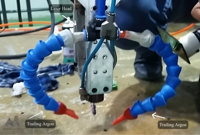 The damaged area in a worn-out impeller machined to reach the functional base metal, and laser additive manufacturing was used for building up on those machined parts to meet the original geometry of the part. To apply additive manufacturing for the repair of a titanium impeller, several key steps were undertaken. First, recognizing titanium’s susceptibility to oxidation above 425 degrees Celsius, a trailing shielding mechanism was devised, illustrated in Figure 2. The additional layers created through this shielding approach appeared in pale yellow, deemed acceptable clads according to ASME standards (as indicated by their prescribed colors), but not sufficient for this application.