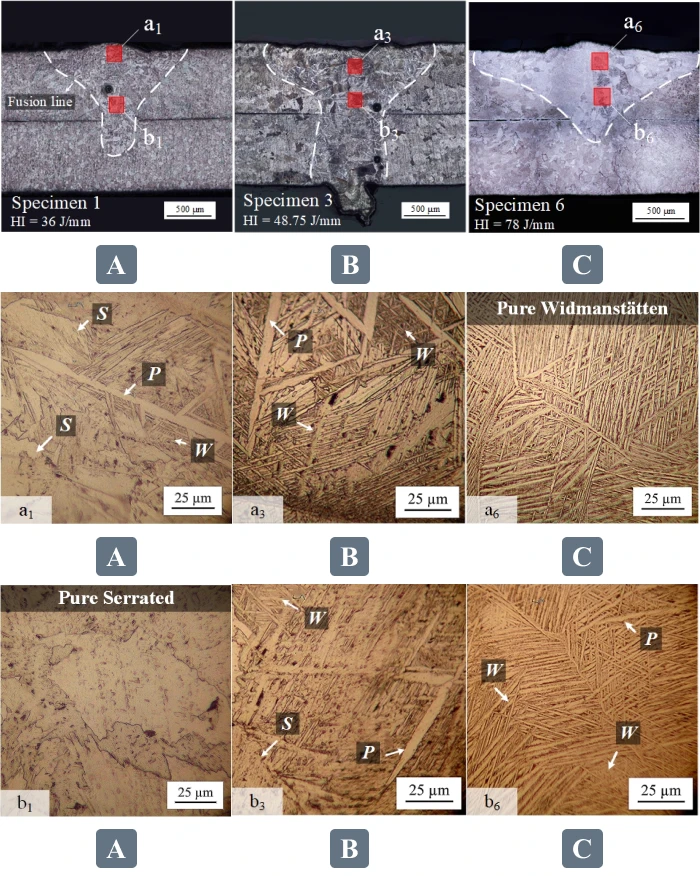 The microstructure features including grain size and morphology are analyzed accordingly. The cross section of specimens 1, 3, and 6 are shown in parts A, B, and C of Figure 4, respectively. It is apparent that the microstructure of the specimen 6 has included more Widmanstätten structure compare to specimen 3, and 1.