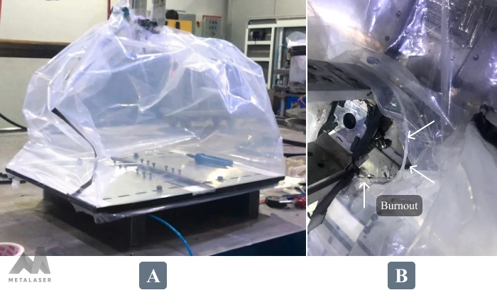 In the realm of laser materials processing for titanium alloys, ensuring proper shielding is paramount due to titanium’s heightened sensitivity to oxygen absorption. The optimal solution involves the use of a gas chamber filled with a neutral gas such as argon, providing a secure environment for the laser processes. However, the challenge arises when implementing this chamber in systems employing motion systems, often robotic in nature. The dynamic movements of the robot hinder the seamless integration of the chamber. To address this, a pragmatic solution involves the use of a flexible plastic chamber, exemplified in Figure 2-A. Despite its adaptability, a critical issue emerges during prolonged laser operation for materials processing. Over time, the laser’s reflection induces a burnout punch hole in the plastic (Figure 2-B), leading to the chamber’s ignition. The intriguing question that follows is: why does this specific region of the chamber succumb to such burnout?