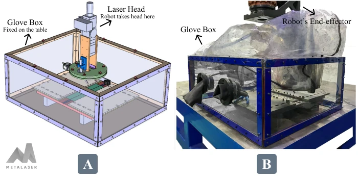 The meticulous design and modeling of the gas shielding chamber were executed through Computer-Aided Design (CAD) software, showcasing the detailed CAD in Figure 4-A. The chamber’s innovative configuration consists of two integral components—the segment affixed to the laser head housing the protective plate and the glove box securely fixed on the table. These components are seamlessly interconnected through the use of flexible plastic, ensuring a cohesive and adaptable structure. These two connect to each other using the flexible plastic.